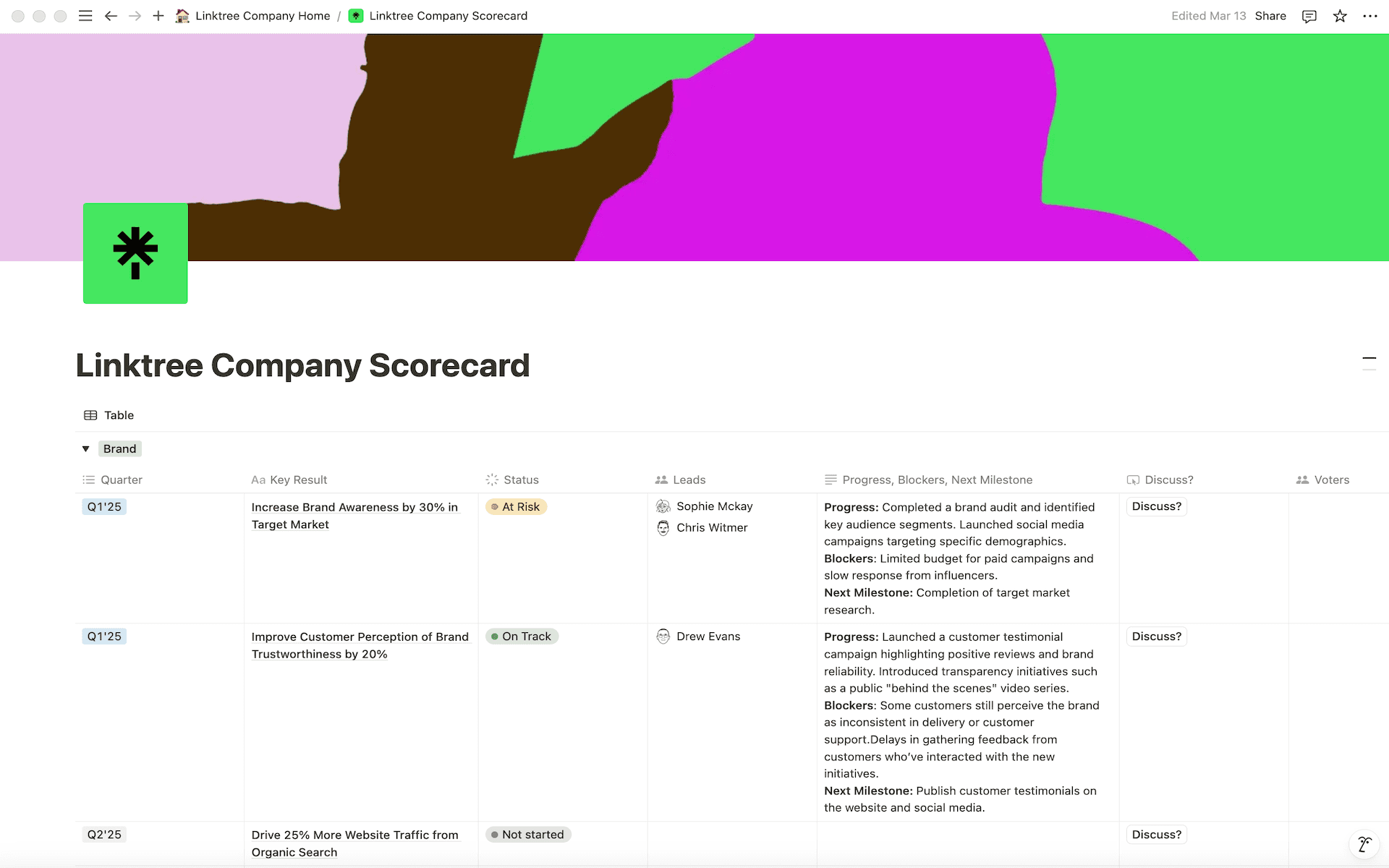 To bring structure to the chaos Linktree relies on its “scorecard” ritual, a streamlined take on the OKR process, managed entirely in Notion. More than just goal-setting, this system acts as a pulse check for progress, tracking key milestones, project timelines, and team accountability in a way that remains both structured and adaptable.